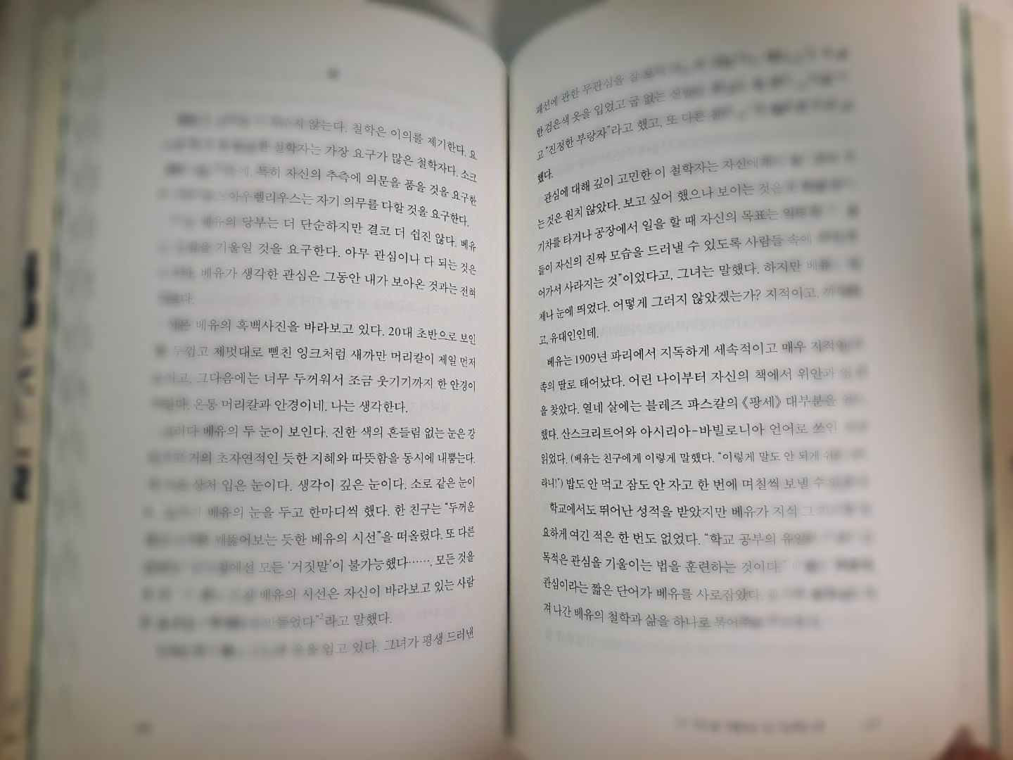 시몬 베유는 이 책을 통해 알게 된 철학자이다. 작가는 "시몬 베유처럼 관심을 기울이는 법"이라는 제목으로 2부 정오의 범주에 그를 배치했다. 배유는 타인의 고통을 자기 고통처럼 느꼈다고 한다. 고통 받는 노동자들을 위해 난방도 하지 않은 아파트에 살았고 딱딱한 마룻바닥에서 잠을 잤다. 이러한 공감능력은 관심에 대한 베유의 급진적 견해를 설명해준다. 관심은 용기나 정의와 다르지 않은, 똑같이 사심없는 동기가 요구되는 미덕이라고 했다. 관심은 사랑이다. 사랑은 관심이다. 진정한 관심은 타인의 존재에 대한 인지 뿐 아니라 그 사람을 인정하고 공경해야 한다고 말한다. 작가는 런던의 세인트판크라스역에서 베유를 기억하고 그녀의 삶을 말해준다.